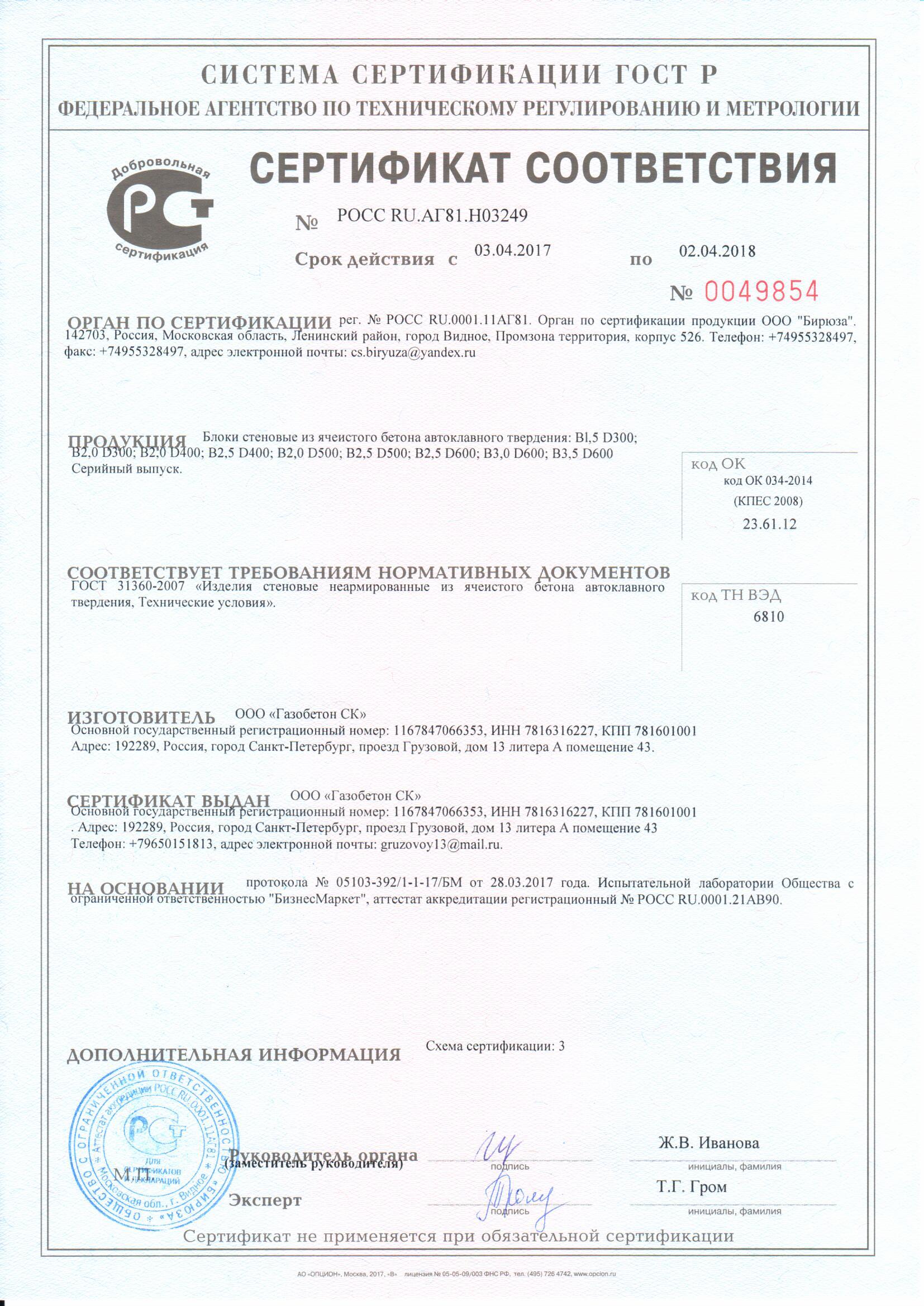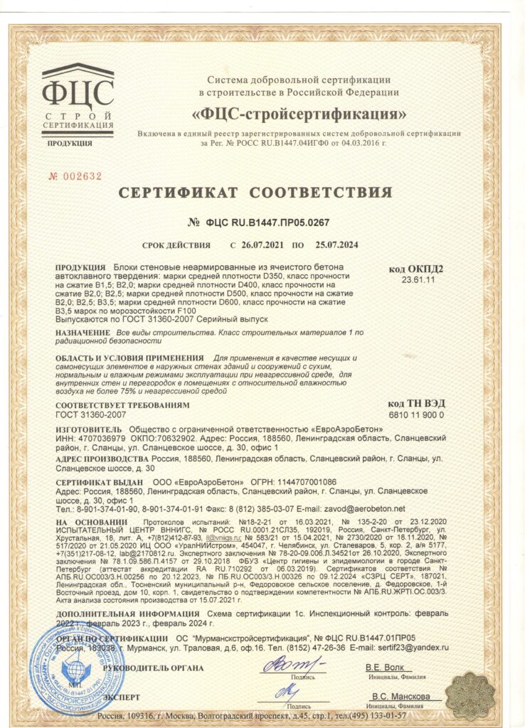Сертификаты газобетона